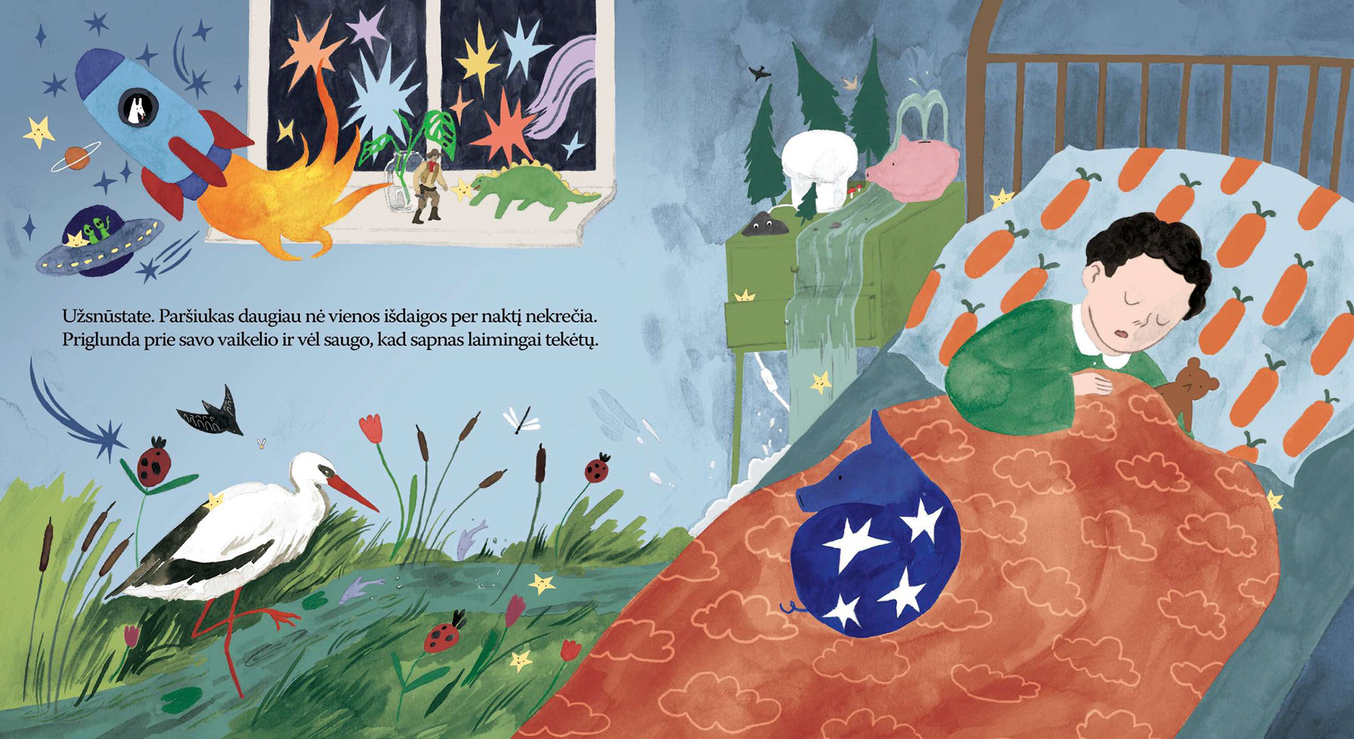 Pagalvinis Paršiukas [The Pillow Piggy] is a children's picture book by Eglė Gelažiūtė-Parnevičienė, illustrated by Philomena Marmion, published by Baltos Lankos in 2023. It can be purchased here.