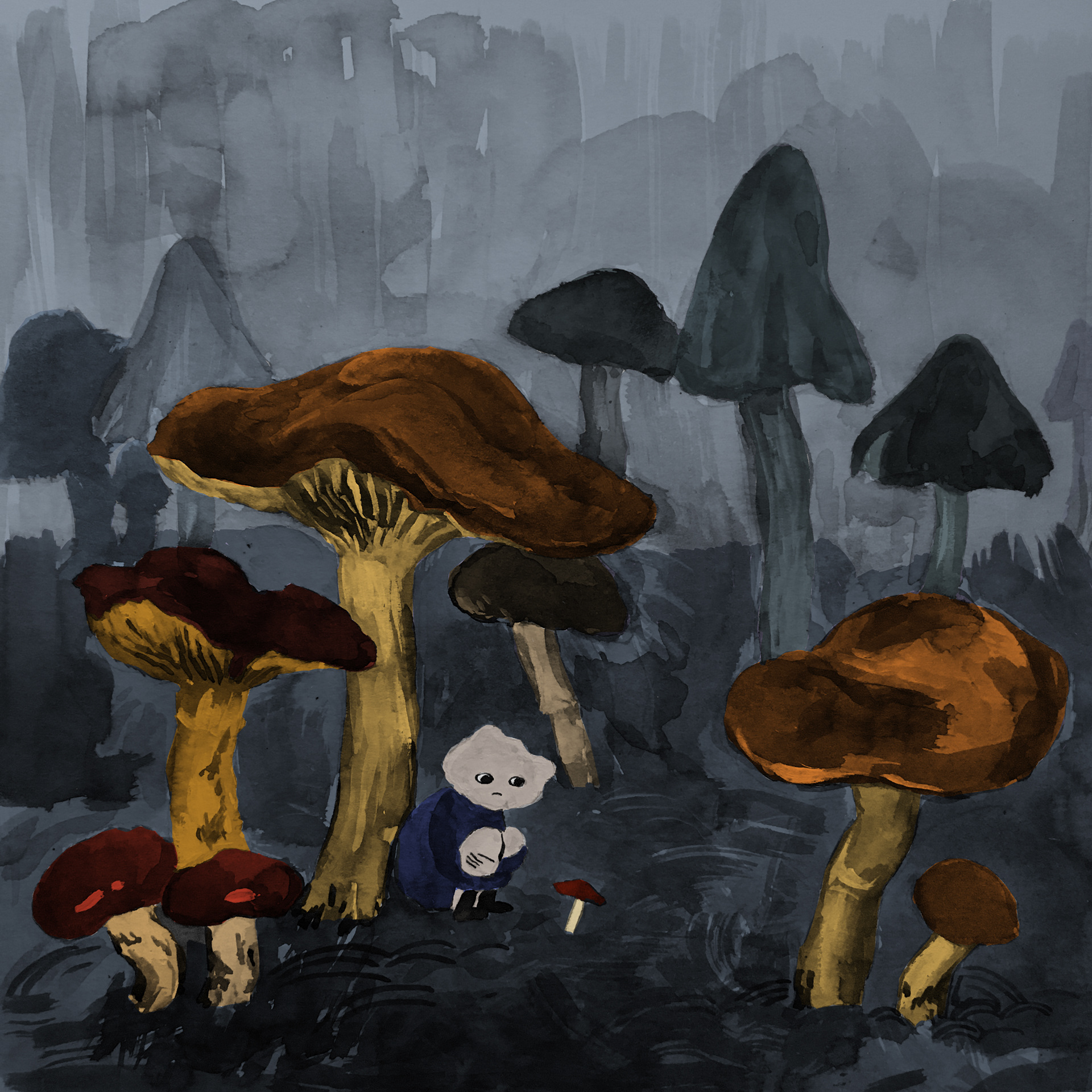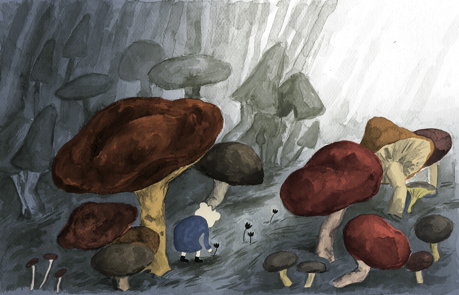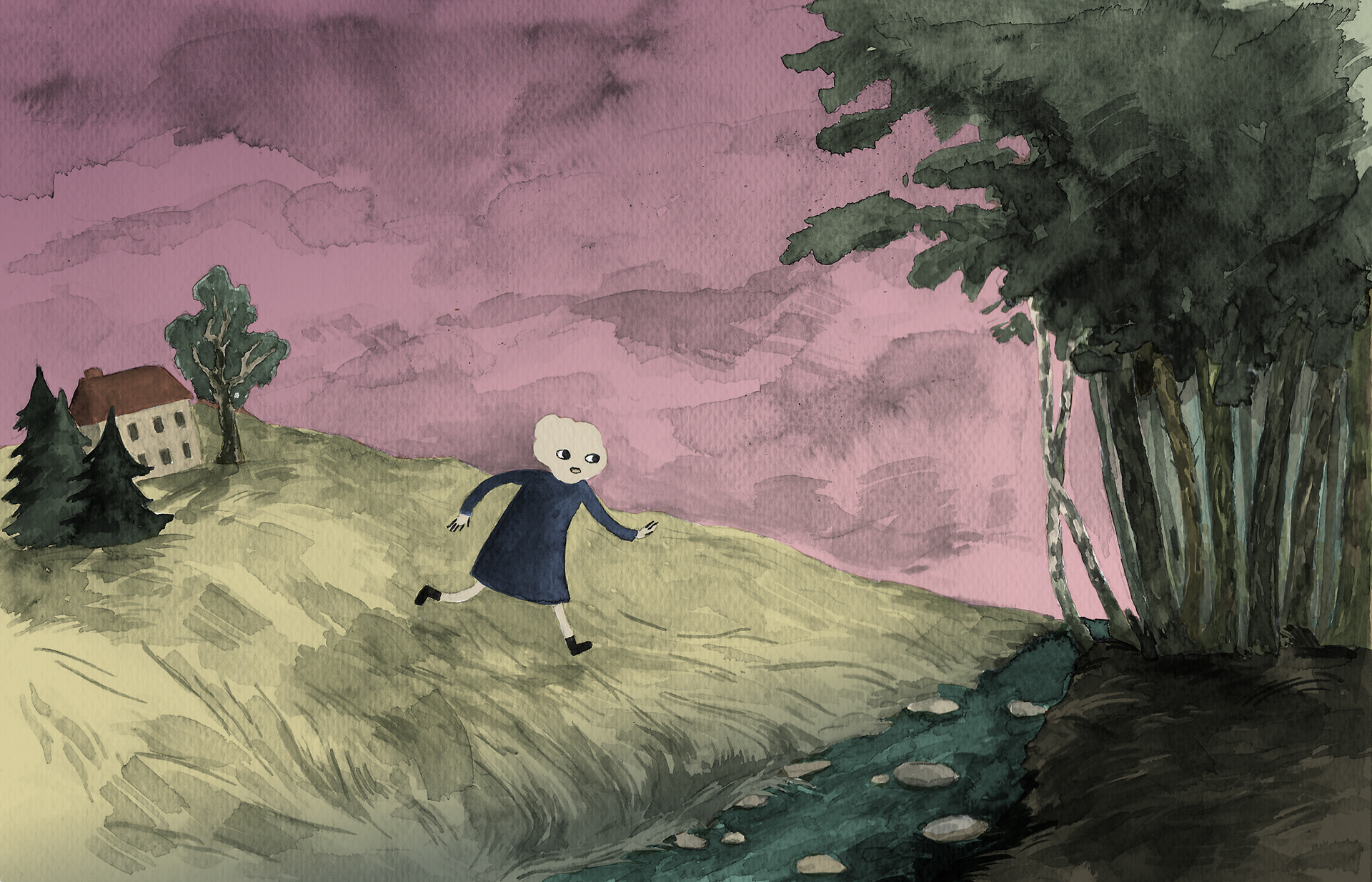 A lost protagonist enters a mysterious and frightening forest. Where is the way out? This 32-page picture book uses visual metaphors to represent the process of loss and grief and explore how these emotions affect one's identity. Although loosely based on autobiographical experiences of grief, this wordless book encourages the reader to apply their own narrative to the images. This makes it an exciting story for readers of any age and background. The picture book was painted in black and white and coloured in digitally.