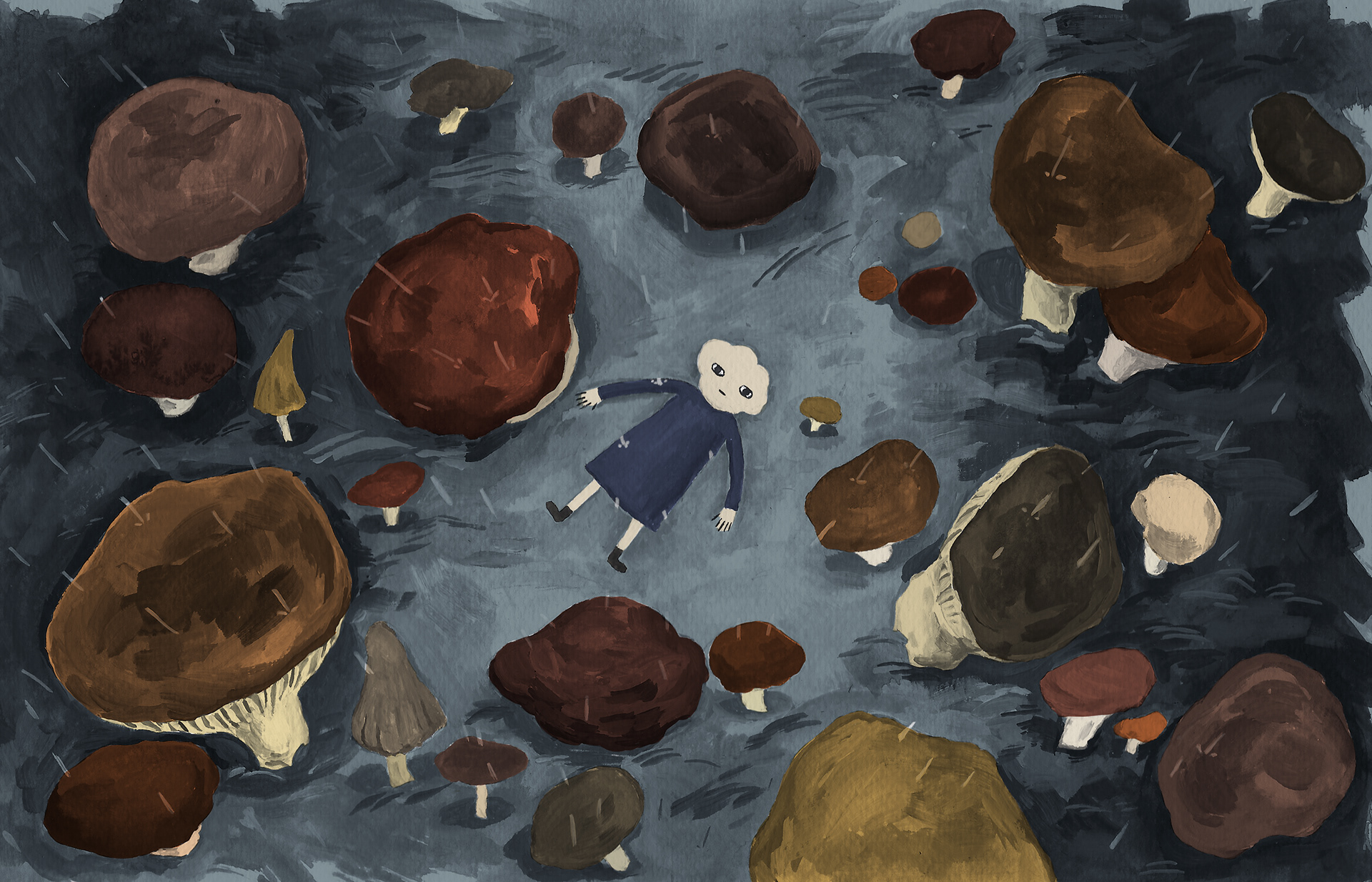 Lying in a field of mushrooms.
